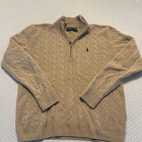 Ralph Lauren Polo genser for herre i størrelse L. Genseren er beige og strikket i kasjmir. Den har rund hals og klassisk flettestrikket mønster. Passer til hverdagsbruk eller som et mer formelt plagg sammen med skjorte eller bukse. Materialet i kasjmir gir et mykt og behagelig plagg som varmer godt.