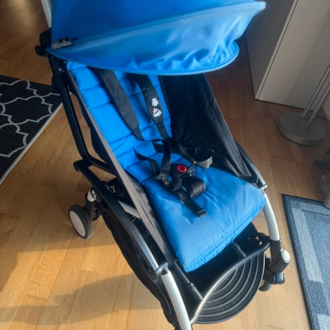 Babyzen YOYO+ trillevogn i blått tekstil med svart understell. Vognen har justerbar rygg, fempunktssele og varekurv under setet. Den kan legges kompakt sammen for enkel oppbevaring og transport. Kjekk skulderstropp for enkelt bæring og vognen får plass i hattehylle på fly.