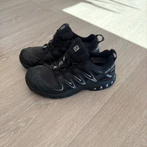 Salomon sneakers/joggesko i størrelse 41 1/2 i Goretex. Skoene er svarte med detaljer i flere farger på lissene. Modellen har hurtigsnøring og yttersåle med grovt mønster. Passer til hverdagsbruk og lett trening eller tur. Overdelen er i tekstil og syntetisk materiale, med polstret hælkappe og tunge for bedre komfort. Sålen er laget for godt grep på ulike underlag.