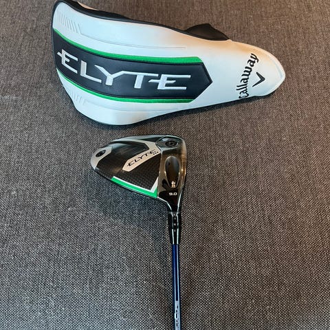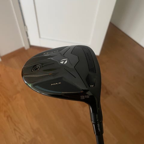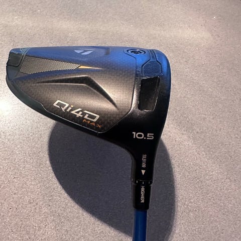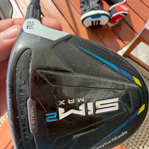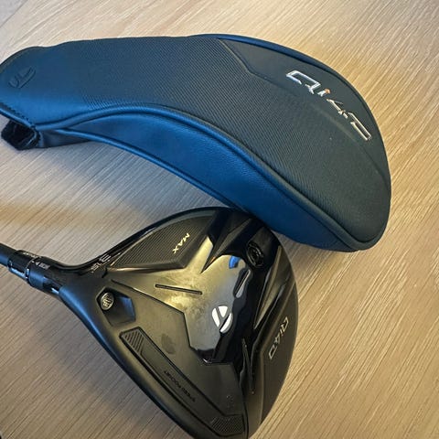 TaylorMade SIM2 driverhode med tilhørende headcover. Køllehodet har karbon-topp og justerbar hosel. Fargekombinasjon hovedsakelig svart, hvit og blå.