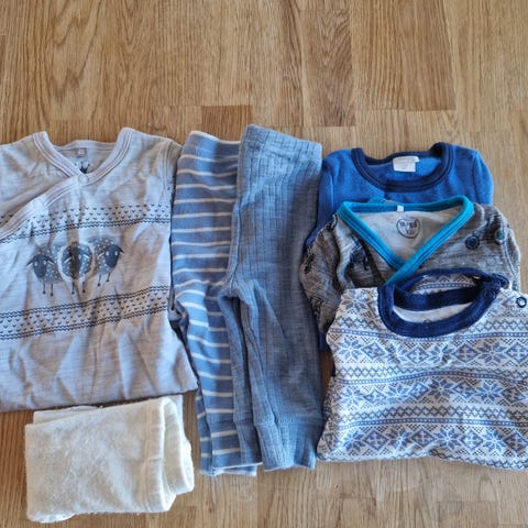 Selger en ullpakke med tre plagg i størrelse 122-128. Passer for barn som er 7-8 år.
