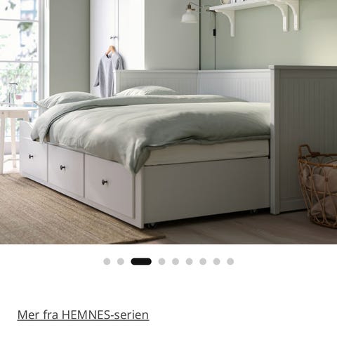 IKEA Hemnes dagseng med skuffer i hvit utførelse. Dagsengen har tre uttrekksskuffer under liggeflaten som gir ekstra oppbevaringsplass. Ribbebunn er inkludert. Mangler en ribbe i ribbenunnen. Når den trekkes ut kan den brukes som dobbeltseng. En av skuffefrontene har en synlig skade, se bilde. Passer for bruk som seng, gjesteseng eller sofa i for eksempel soverom, barnerom eller gjesterom.