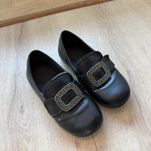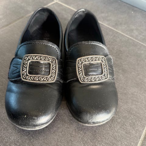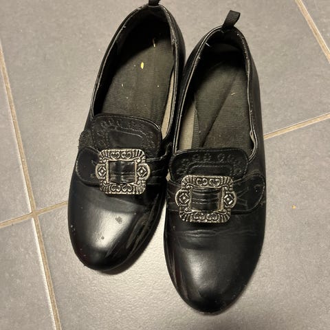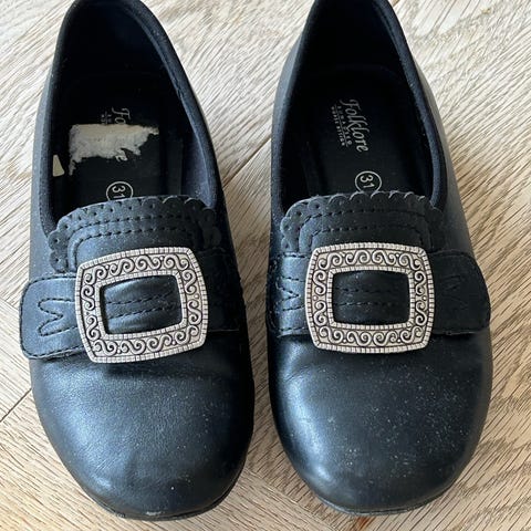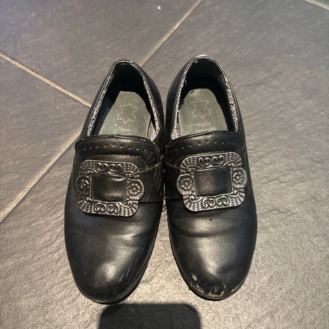 Bunadsko til barn str 31 fra husfliden. Skoene har en solid såle og en strikk over åpningen av skoen.