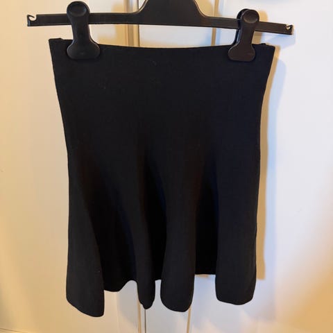 ella&il svart skjørt i merinoull i størrelse XS. Det passer meg som har str S (36) så vil si at det kan også passen en Small, men er da mer tettsittende, som man kan se på bildene. Skjørtet har en flatterende passform og stoffet faller pent. Ingen synlige feil eller mangler. Ingen nupper.