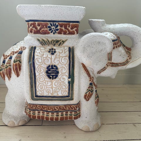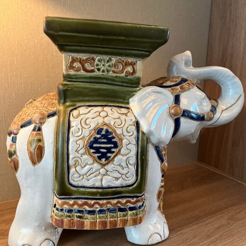 Selger et flott sett med tre dekorative elefanter i keramikk/porselen med rik dekor. Kan brukes som pidestall, plantebord eller som unike pyntegjenstander.