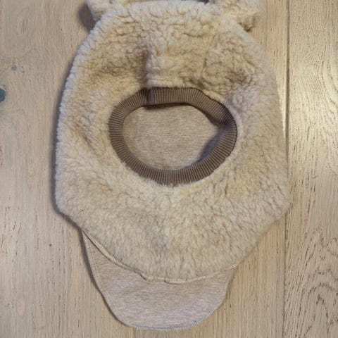 Hust & Claire balaklava i ull med bomull på innsiden. Står ikke størrelse i, men vil si ca 6-12 mnd. Farge beige/brun. Ingen bruksmerker utenom at ullfeece blir fort nuppete, så noen nupper forekommer.