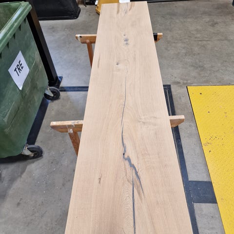 Nydelig håndlaget spisebord som eneste av sitt slag i heltre eik. Solid og med flotte naturlige konturer fra treets naturlige form. Bena er også i heltre eik.