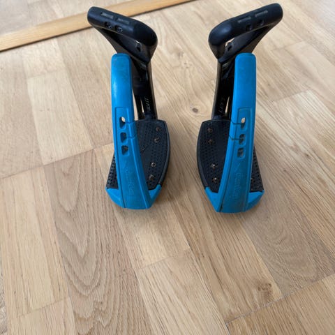 Freejump stigbøyler med tilhørende stigbøylereimer. Stigbøylene er blå. Stroppene er i brunt lær.