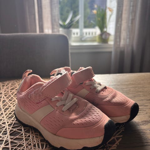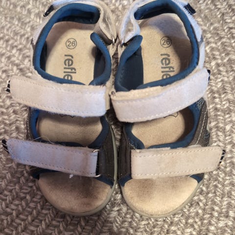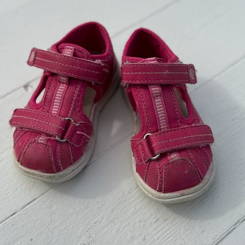 Reflex sandaler for barn, jente, i størrelse 26. Sandalene er i rosa med grå såle og har lukket tå med pustende meshdetaljer. De har justerbar stramming med strikk og stopper over vristen for bedre passform. Sålen har kraftig mønster for godt grep. Egnet som sommersko eller til bruk ute i tørt vær. Brukt av et barn i en sesong.