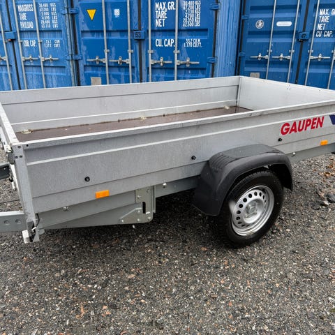 Gaupen tilhenger i grå utførelse. Praktisk henger for transport av ulike typer last. Hengeren har karmer i metall og er utstyrt med lys bak samt registreringsskiltfeste.