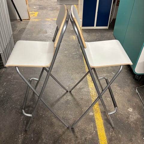 To enkle og stilrene hvite barstoler/barkrakker fra IKEA. De er sammenleggbare og derfor praktiske å oppbevare når de ikke er i bruk. Perfekte som ekstrastoler.