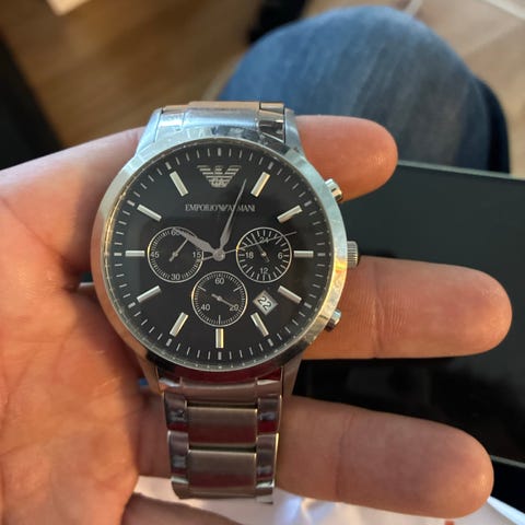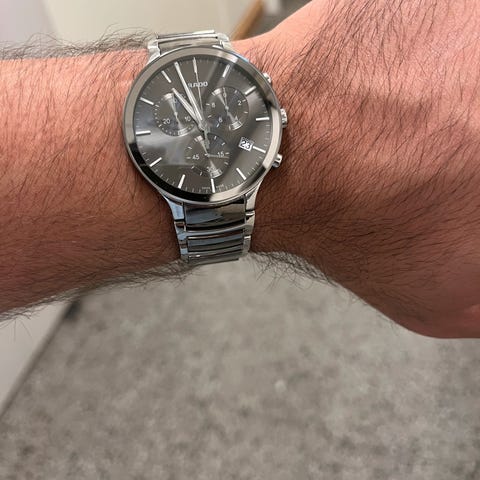 Gant herreklokke med kronograf og datovisning. Klokken har rund kasse, grå urskive med markerte indeksstreker og tre små skiver for kronograffunksjonene. Urkassen og lenken er i metall med klassisk leddet stållenke og foldespenne. Modellen passer som hverdags- og penklokke til herre.