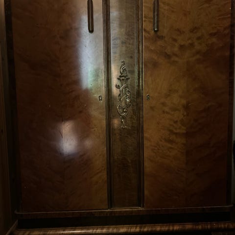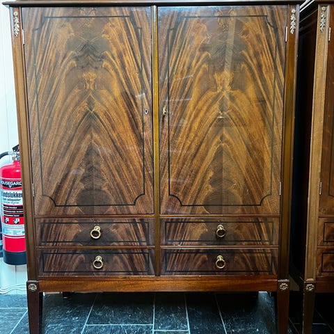 Barskap i tre i brun utførelse. Skapet har to dører med dekorativ trefinér på fronten. Innvendig er det speil i bakveggen, hyller og integrerte holdere til flasker og glass i dørene. Skapet står på fire rette ben som løfter det fra gulvet og gir lett tilgang under. Egner seg til oppbevaring og organisering av drikkevarer og barutstyr i stue eller spisestue.