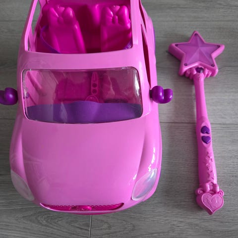 Leketøysbil i plast med åpent tak og sitteplasser til små figurer eller dukker. Bilen er rosa med lilla detaljer. Den leveres med en matchende rosa fjernkontrollstav formet som en tryllestav, som brukes til å styre bilen. Egner seg som innendørs leke for barn som liker biler og rollelek.
