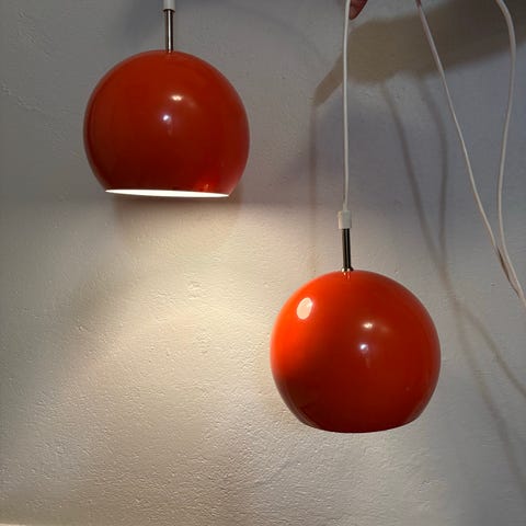 To vintage italienske magnetlamper / kulelamper fra 1960-tallet. En signalrød og en oransje.