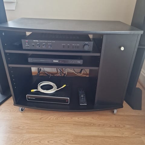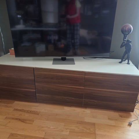 Pent tv-bord / tv-benk gis bort. Svart med glassplate og 2 skuffer.