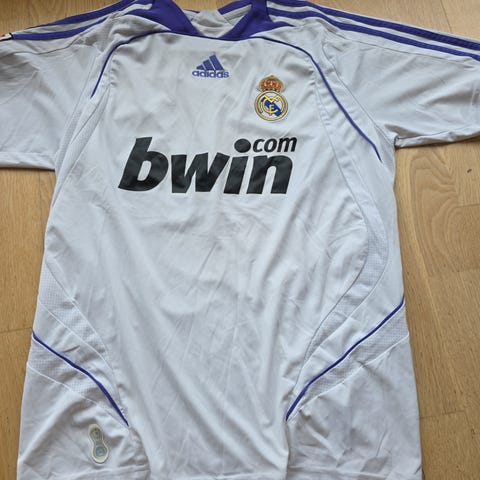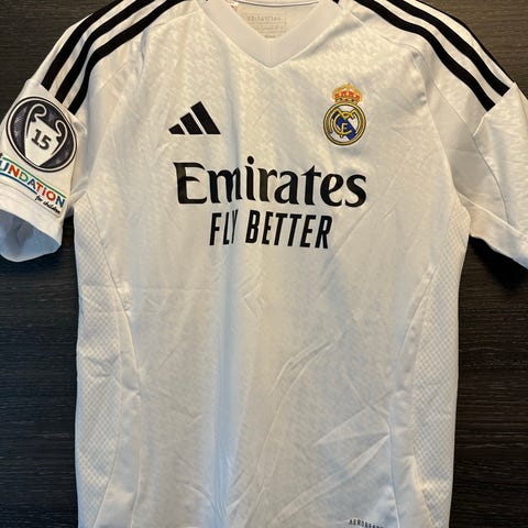 Adidas Real Madrid fotballdrakt i hvit farge. Drakten har klubbens logo på brystet, Adidas-logo og sponsortrykk på fronten. Kontrastdetaljer i svart langs skuldre og ermer. Kortermet modell egnet til fotball og annen trening, eller som supportereffekter til kamp og fritid.