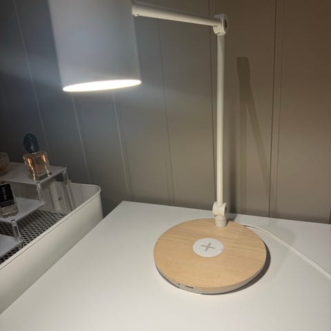 Ikea nattbordlampe med integrert trådløs lader.