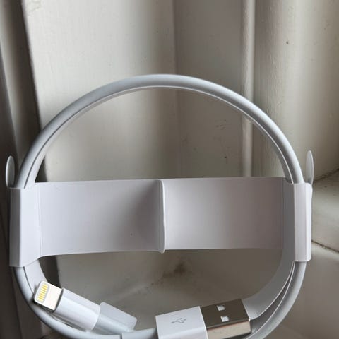Apple laderkabel i hvit farge. Kabelen har tilkobling for lading og dataoverføring mellom kompatible Apple-enheter og strømforsyning eller annet utstyr.
