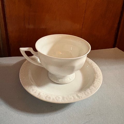 1 stk. "Foglia" tefat til kaffeservise fra Villeroy & Boch selges til kr. 150. Vakker, kremhvit farge. Laget i vitro porselen, og tåler oppvaskmaskin. Diameter er 14,5 cm. Sender gjerne hvis mottaker betaler frakt (ikke FiksFerdig).