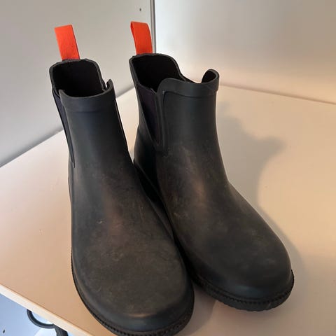 SWIMS regnstøvler i størrelse 38. Kort modell i svart med elastiske paneler i sidene og hemper bak i oransje for enkel av- og påtaking. Såle i gummi med mønster for grep på vått underlag. Passer til bruk på regnværsdager og i fuktige omgivelser. Selges fordi jeg har kjøpt nye.