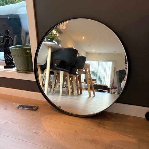 Fint rundt speil med svart ramme.
