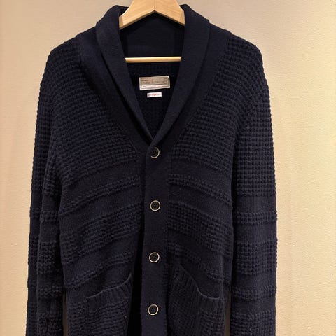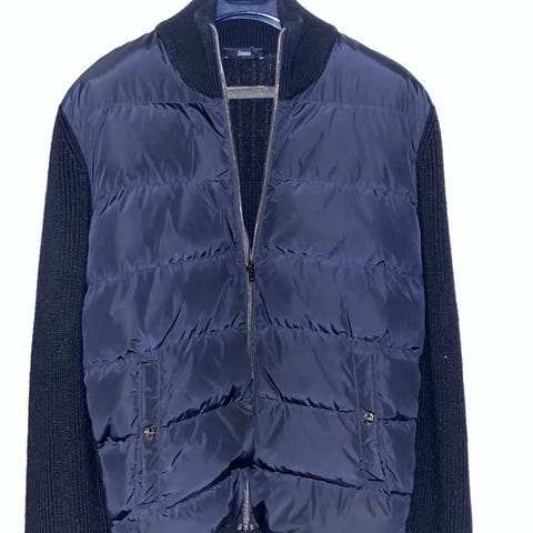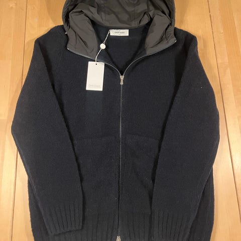 Fin cardigan kjøpt hos Follestad, i størrelse 52 tilsvarende M-L. Jakka har avtagbar hette og er personlig kjempe fornøyd med denne som overgangsjakke. 100% virgin wool, men fremdeles ikke for varm for vårsola.