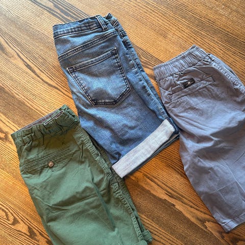 Fire ulike bukser til ulike anledninger: en joggebukse, en mørkeblå penbukse, en dongeribukse og en beige newbie-bukse.