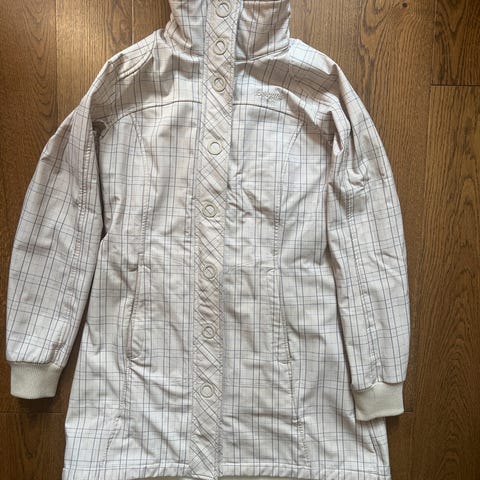 Pent brukt Bergans softshell kåpe for dame i størrelse M. Kåpen er beige med rutemønster og er laget i polyester. Modellen har hette, glidelås i front og to skråstilte glidelåslommer foran. Ribbestrikkede mansjetter på ermene gir en tettere avslutning ved håndleddene. Egnet som ytterplagg i hverdagen i overgangsårstidene.