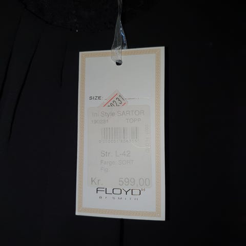 Floyd bluse for dame i størrelse L. Blusen er svart og laget i polyester. Ermene er i gjennomsiktig mesh med prikkemønster og rynket avslutning ved håndleddet. Passer til bruk både til hverdags og mer pyntede anledninger. Selger også skjørt i polyester, stilfullt med rysjer lag på lag. Strikk i livet. Bluse og skjørt selges for kr.900. Nypris kr.1800. Kun brukt 1 kveld.