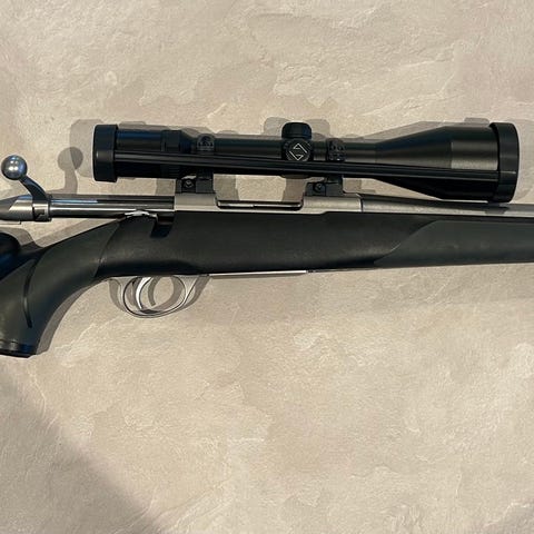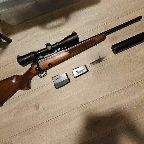 Følger med demper til alle løpene. 5 magasiner( 2 5skudd til 22lr,. 9skudd og 2 5skudd til 17hmr/22wmr?
