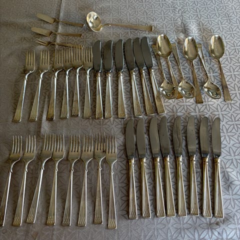 Jeg selger 2 stk. av dette bestikket dette er det største. Det passer sammen men middags kniver gafler og spiseskjeer er mindre på det andre bestikket jeg har til salgs med 53 deler.