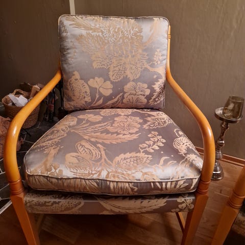 Selger en gammel, men veldig pen sofagruppe. To stoler og en toseter. Har bare tatt bilde av den ene stolen da resten står i garasjen. Gult stoff.