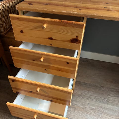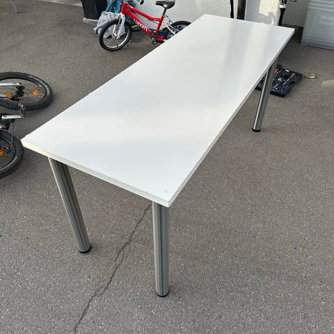 Selger dette gamle skrivebordet fra IKEA. Det er stort og solid og passer den som trenger et stort skrivebord/arbeidsplass. Bein av metall. Skrivebordet er demontert, skruer medfølger.