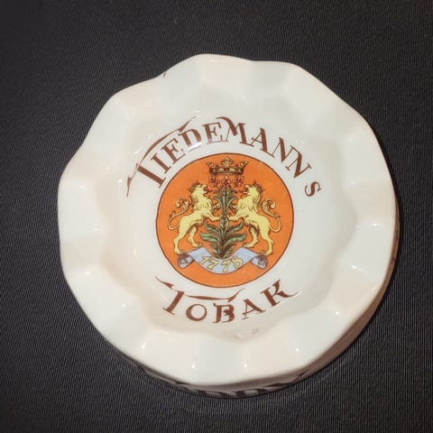 Tiedemann’s Tobak askebeger i hvit keramikk. Askebegeret har rund form med fasetterte kanter og dekor med tigerhode og teksten «Tiedemann’s Tobak» i midten. Egnet som askebeger eller som samleobjekt/dekorasjon.