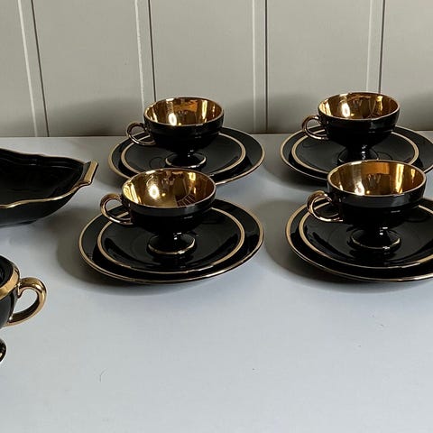 Stavangerflint asjetter til kaffe og kaker. Belagt i sort og gull. Det er 10 stk, og de bærer preg av bruk da de har noen merker og noe avskjæring på den gullbelagte kanten. Fortsatt utrolig nydelige, og har mye bruk igjen!