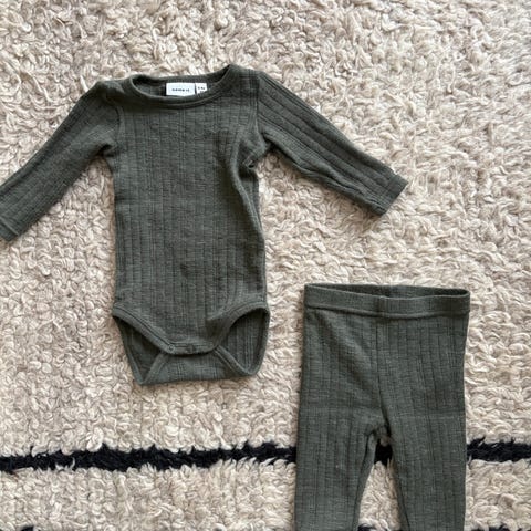 Lillelam body i str 62 og strømpebukse i str 62-68. Brukt kun én gang da baby fikk eksem.