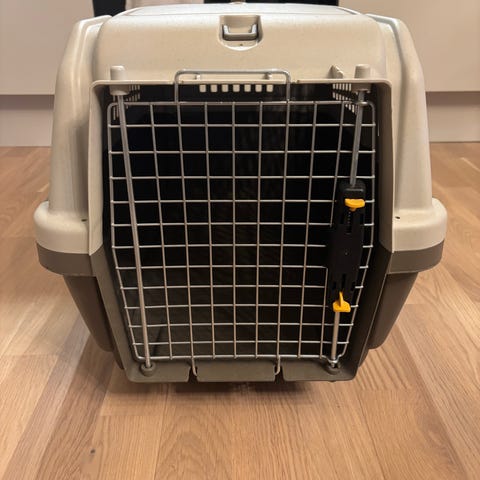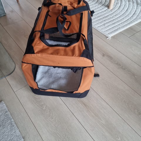 Praktisk og solid reisebur i tekstil til hund eller katt med mange åpninger og god lufting. Veske til mat og vannflaske. Kan legges sammen. Lengde 57 cm, bredde 43 cm, høyde 42 cm. Brukt noen få ganger. Stått lagret lenge og har noe utdaterte farger, men er i god kvalitet.