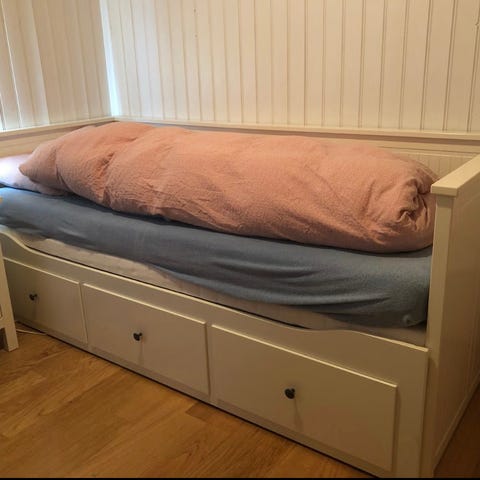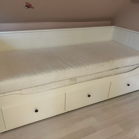 IKEA dagseng med skuffer i hvit utførelse. Sengen har liggeflate til én person og integrerte oppbevaringsskuffer under madrassen. Egner seg som enkeltseng eller dagseng i soverom, barnerom eller gjesterom. Utført i lyst materiale som passer inn i de fleste interiører.følger med Madras og overmadrass.