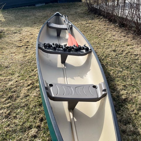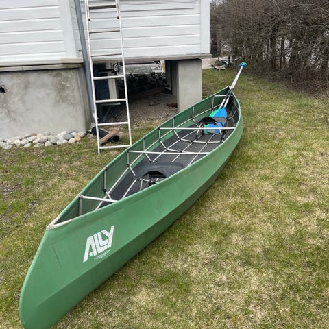 Ally kano i grønn farge. Kanoen har rammeverk i aluminium og svart innvendig bunn. Den er utstyrt med to seter og flere tverrstivere for stabilitet. Egnet for padling på innsjøer og rolige elver, samt turbruk med plass til utstyr foran og bak setene. Leveres med årer og tilbehør som vist på bildene.