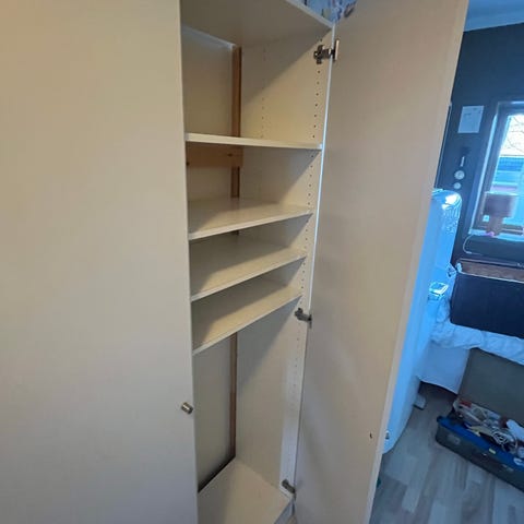 Garderobe skap gis bort mot rask henting. Mangler noen plater i 3 skuffer, men det kan lett kjøpes på IKEA. Og det er en knag som er limt på siden, den kan enklest fjernes med super lim fjerner.
