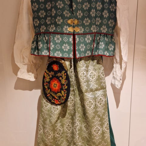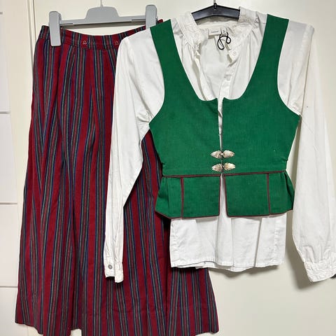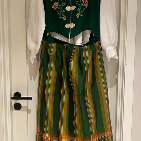 Ny trønderbunad str 4-6 år sydd av stoffer kjøpt på Husfliden. Grønn gloria. Har to stk. i samme størrelse og farge. Består av vest, stakk, forkle, skjorte og hårbånd. Ta kontakt for evt prøving. Mob. 90129196