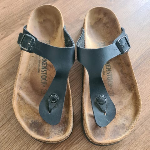 Birkenstock sandaler i størrelse 36. Modellen har svart rem med tåstropp og justerbar spenne. Fotsengen er formet med støtte til fotbue og hæl, og sålen har mønster for bedre grep. Egner seg som hverdagssandaler i varme perioder.