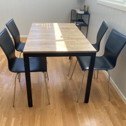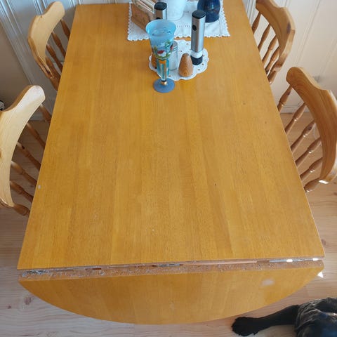 Selve treverket er bra, både på bord og stoler. Bordplaten har ingen gjennomgående riper men mindre hairlines