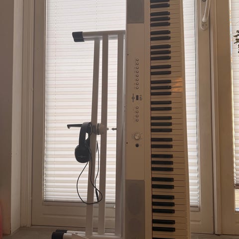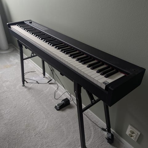 Gear4music SDP-3 stage piano med 88 vektede tangenter i svart utførelse. Pianoet står på et tilpasset stativ i samme farge og leveres med sammenleggbar pianokrakk. Instrumentet har kontrollpanel med ulike funksjoner og lyder, samt notestativ montert bak tangentene.