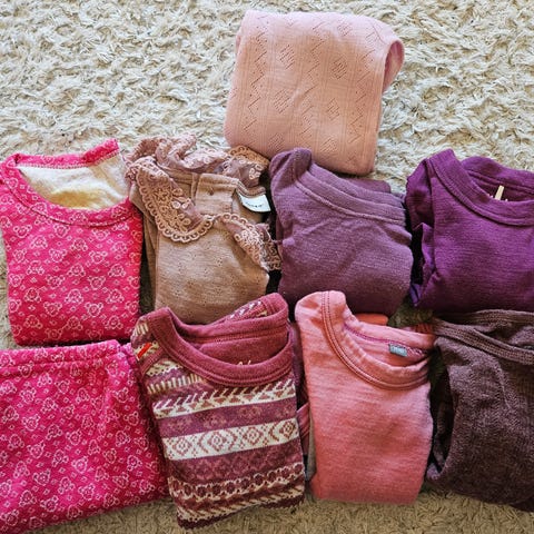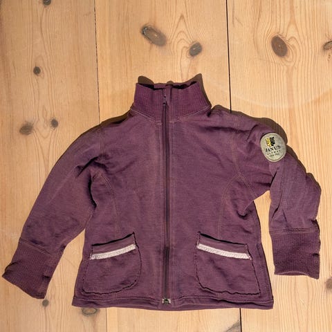4 ullgenser (to fra Janus) for jente i størrelse 86-92. Flekk på den ene, men ingen hull.