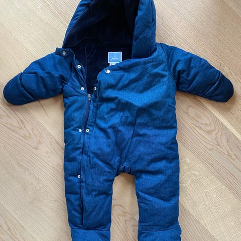 Med baby til fjells i påsken? 🐣 Dette er dressen som holder gullungen varm når han sitter på fanget ditt eller er i bæreselen. Dressen har poser til hender og føtter som er festet med små knapper på innsiden av mansjettene. Pent brukt, noe lett misfarging i stoffet i fronten på den ene siden som kun er svakt synlig. Fleece på innsiden.