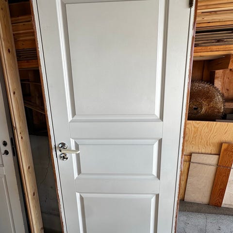 Hvit innerdør med karm. Døren har klassisk, enkel profil og leveres med dørhåndtak og låskasse montert. Egner seg som innvendig dør i bolig, for eksempel til soverom, bad eller andre rom. Døren er hengslet på siden som vist på bildene, og karmen følger med for innsetting i veggåpning.