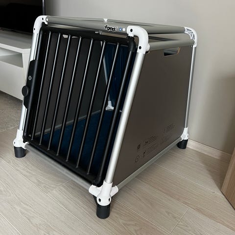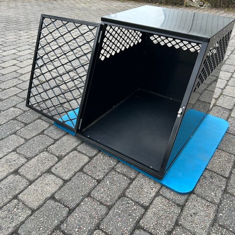Hundebur til bil. Brukt til Flatcoated retriever. Brukt i en Saab stasjonsvogn. Buret er stort. Selges da det er for stort til min nye bil. Følger med stropper.