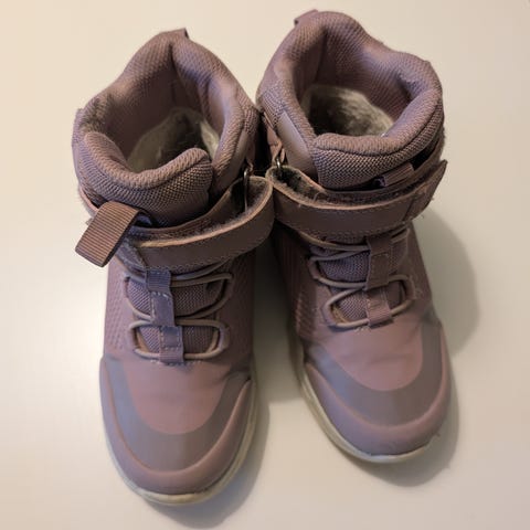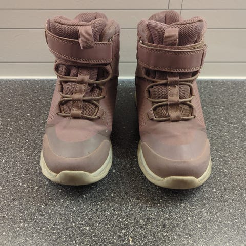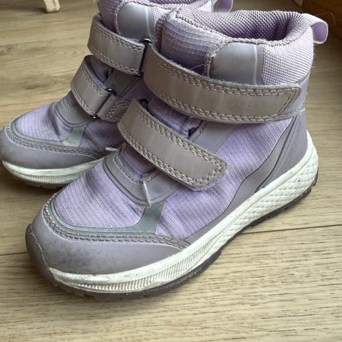 Vikafjell barnesko i størrelse 32. Skoene er i en lys lilla farge med hvit såle. Modellen har borrelås og elastiske lisser for enkel av- og påkledning. Grovmønstret yttersåle gir godt grep på underlaget. Egnet som hverdagssko eller til lett turbruk for barn.